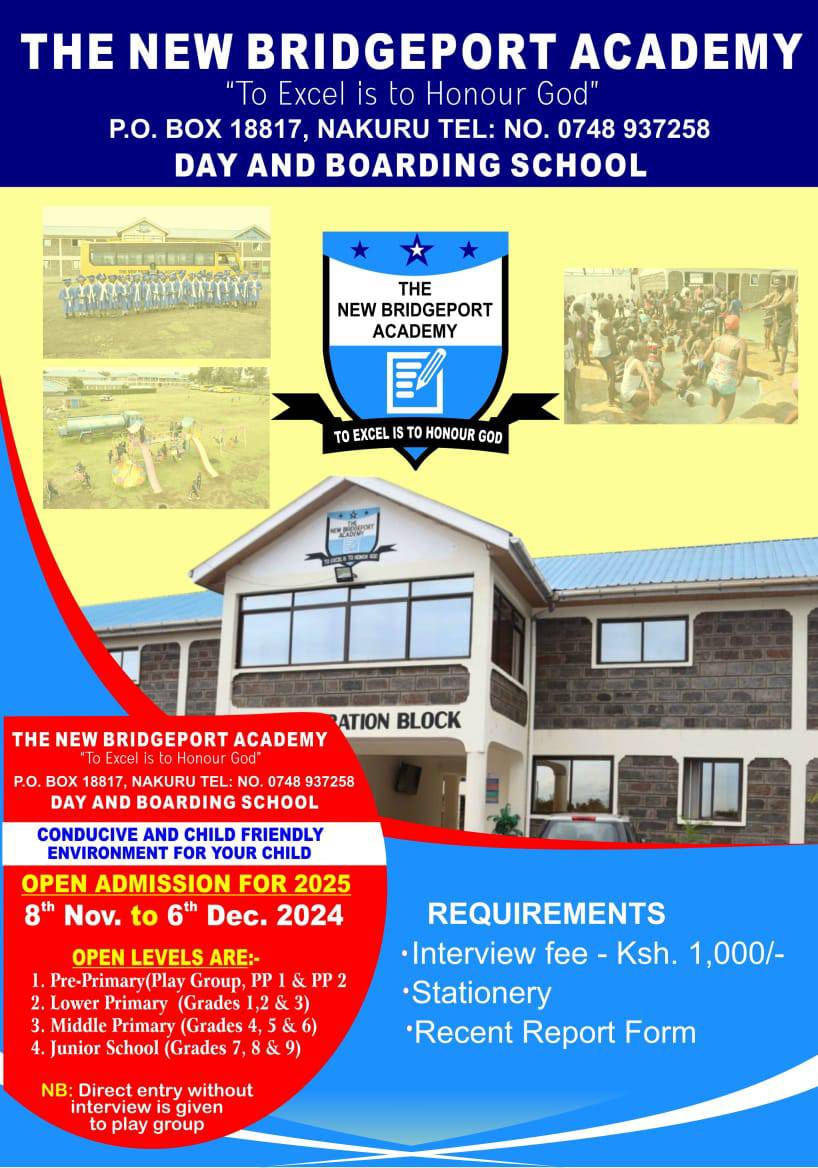 The New Bridgeport Academy, located in Nakuru, is a premier day and boarding school dedicated to providing a holistic and child-friendly learning environment. Guided by the motto “To Excel is to Honour God,” the school fosters academic excellence, character development, and spiritual growth. With state-of-the-art boarding facilities, modern classrooms, and ample recreational spaces, it ensures a well-rounded experience for pupils. Admission for 2025 is open from 8th November to 6th December 2024, catering to learners from Pre-Primary to Junior School (Grades 9). By combining quality education, comfortable living, and a nurturing atmosphere, The New Bridgeport Academy prepares students for a bright and successful future.